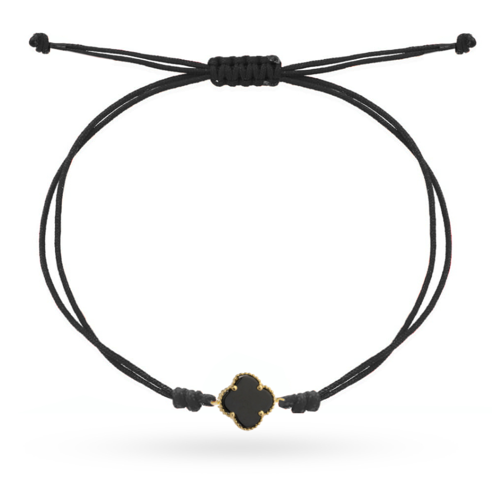 Bransoletka złota czarna koniczynka na czarnym sznurku