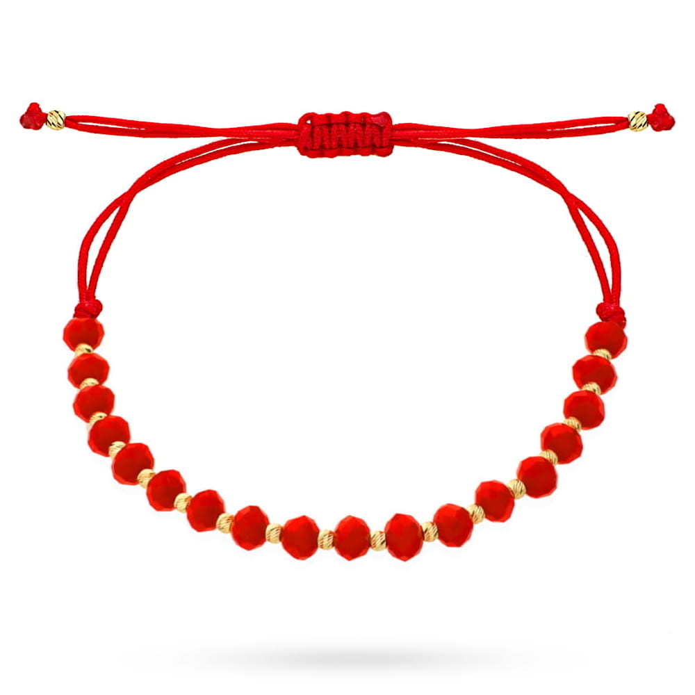 Bransoletka złote diamentowane kulki oraz czerwone kamienie na czerwonym sznurku