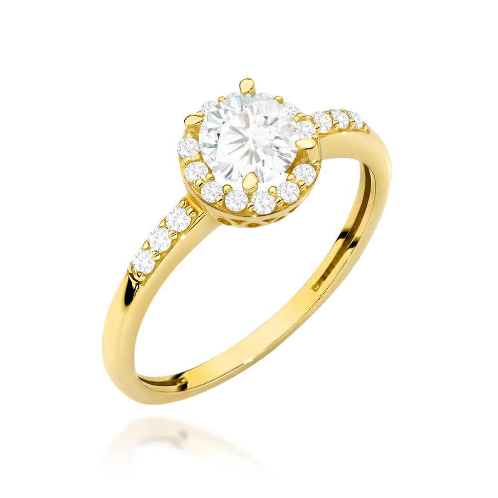 Pierścionek złoty z centralną cyrkonią w oprawie mniejszych i ozdobną szyną