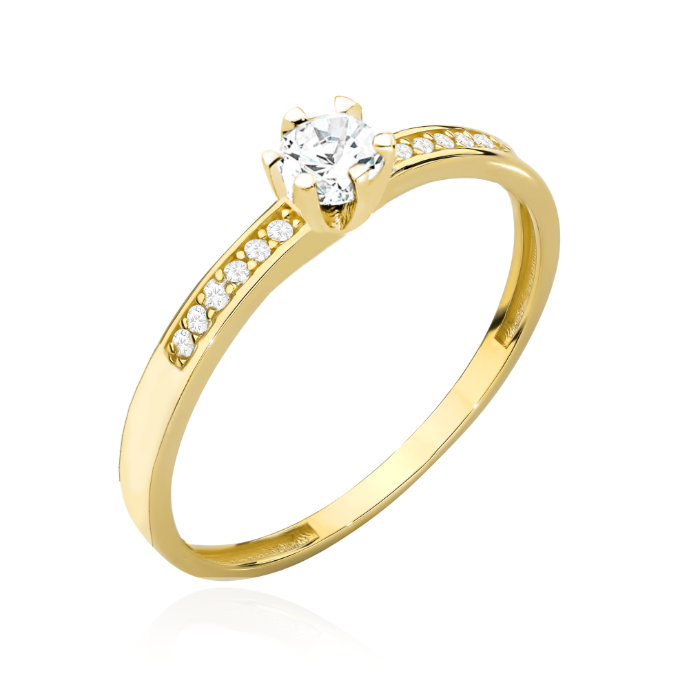 Pierścionek złoty z centralną cyrkonią w sześciu łapkach i szyną zdobioną cyrkoniami