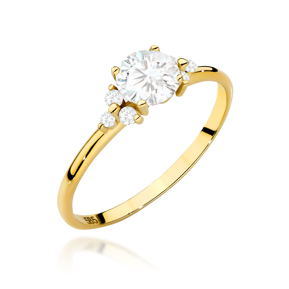 Pierścionek złoty z centralnym kamieniem zdobiony cyrkoniami