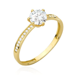 Pierścionek złoty z centralną cyrkonią w sześciu łapkach z cyrkoniami