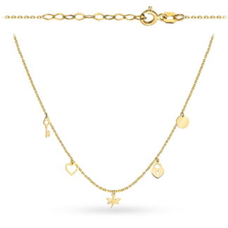 Naszyjnik złoty kluczyk, serce, ważka, kłódka i pełne kółko