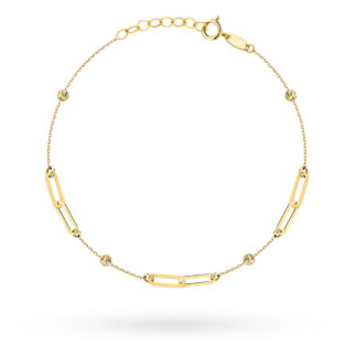 Bransoletka złota z pełnymi kółkami, ringiem i diamentowanymi kulkami na podwójnym łańcuszku